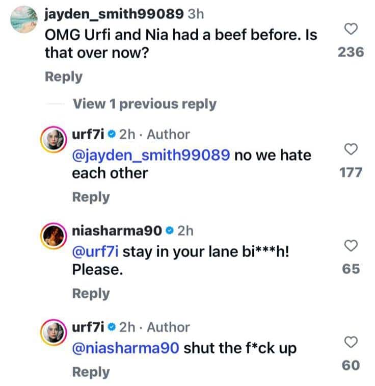 एक यूजर ने कमेंट करते हुए लिखा, इससे पहले निया शर्मा और उर्फी जावेद ने साथ में बीफ खाया है. क्या मैं ये समझूं कि इनके बीच का झगड़ा खत्म हो गया है. देखते ही देखते निया शर्मा और उर्फी जावेद ने इस यूजर को जवाब देने शुरू कर दिए. सबसे पहले उर्फी जानेद लिखा, नहीं हम अब भी एक दूसरे की शक्ल से नफरत करती हैं. जिसके सवाब में निया शर्मा ने लिखा, अपनी हद में रह चुड़ैल... निया शर्मा का जवाब सुनकर उर्फी जावेद फिर भड़क गईं. उर्फी जावेब ने बदले में लिखा, अपना मुंह बंद कर ले. अब सोशल मीडिया पर निया शर्मा और उर्फी जावेद का ये झगड़ा तेजी से लोगों का ध्यान अपनी तरफ खींच रहा है. कहा गलत नहीं होगा कि स्प्रिट्सविला शुरू होने से पहले निया शर्मा और उर्फी जावेद का ये हाल देखकर तो फैंस को भी सदमा लग गया है.