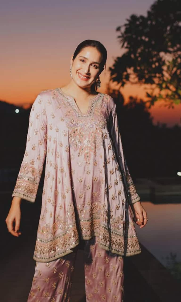 Sagarika exudes understated elegance with a sheer dupatta and a peach embroidered kurta softly framing her look.